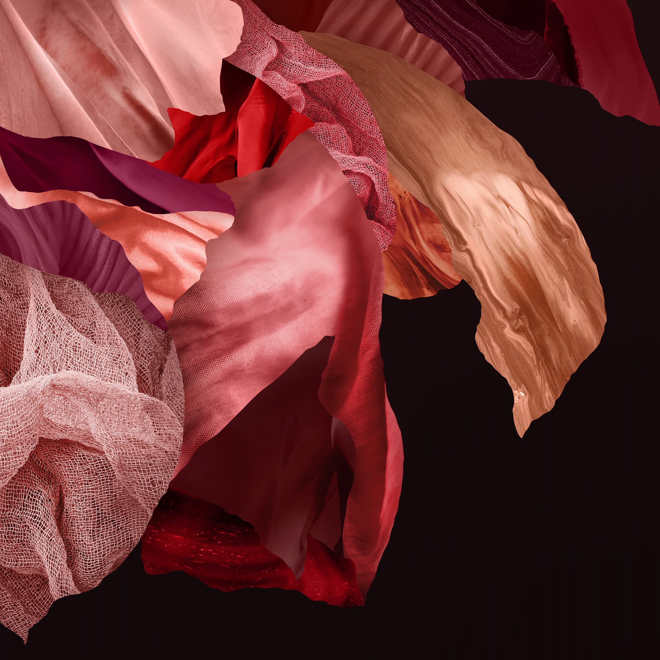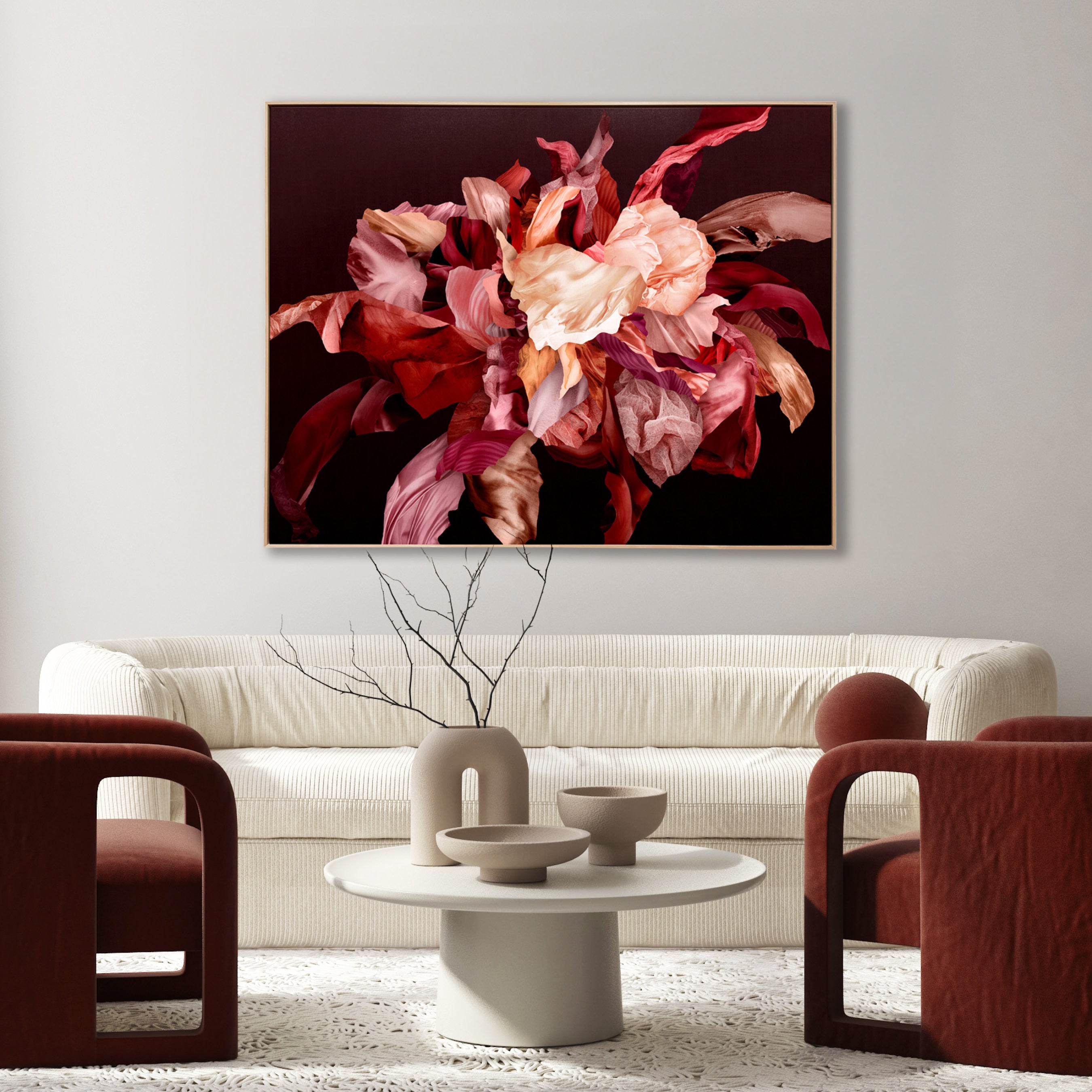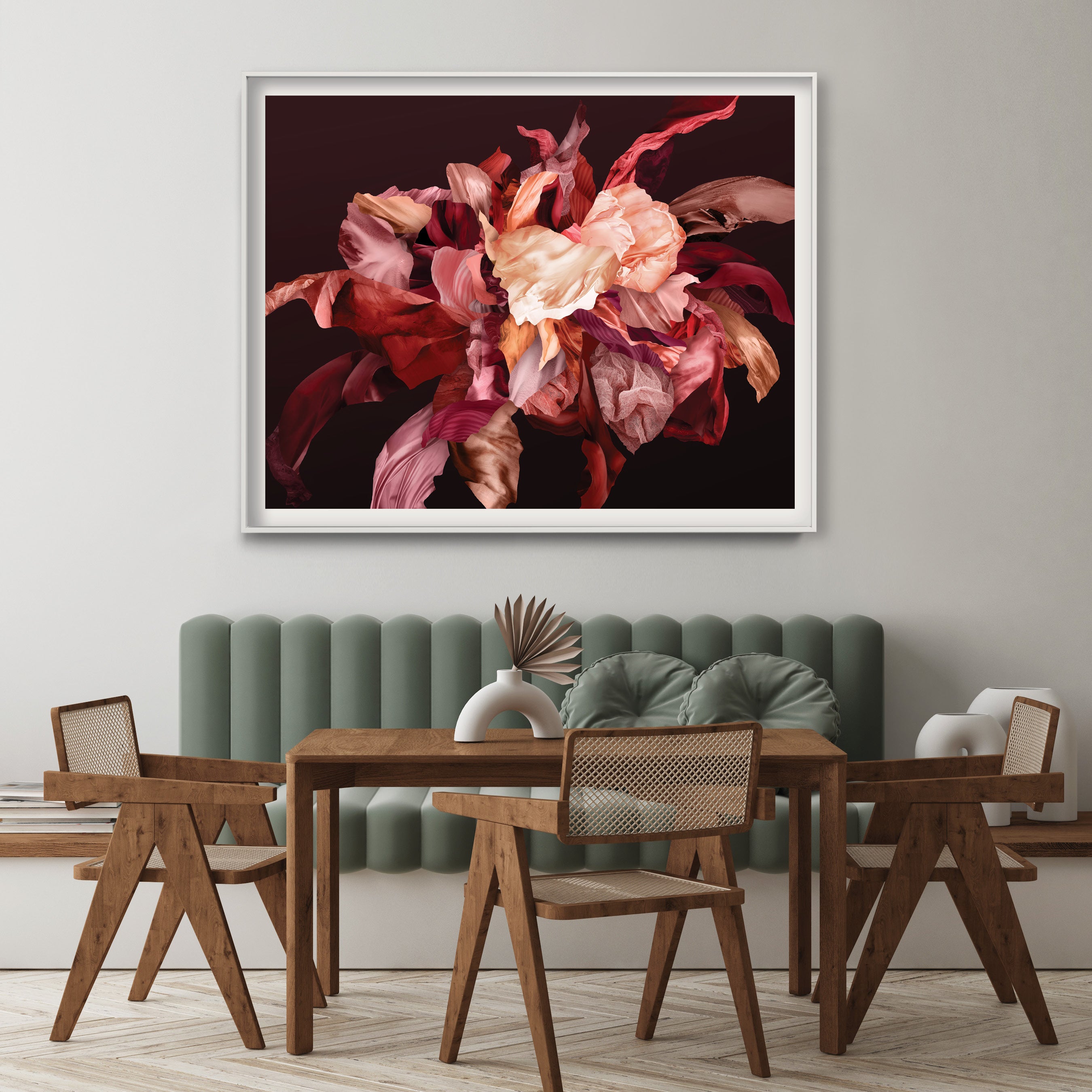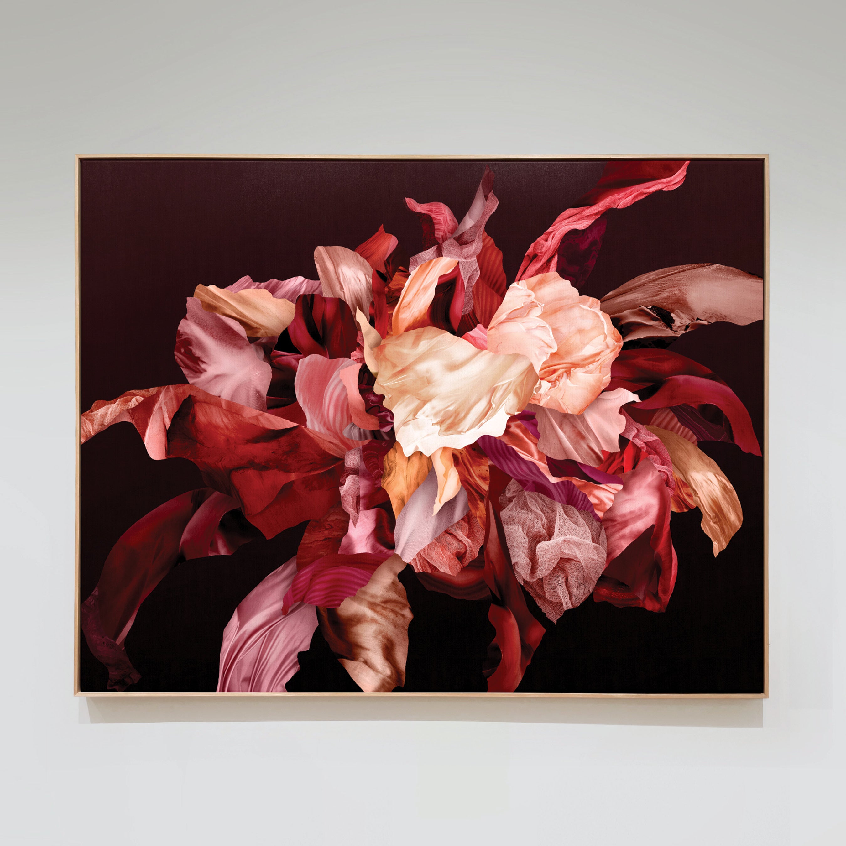 A dramatic explosion of rouged beauty, this artwork masterfully layers photographic elements with organic and alternative textured forms. Rich, warm, and meticulously detailed, it transforms any space, becoming a striking centrepiece. The intriguing contrasts between textures, defying conventional placement, challenge traditional ideals of beauty and invite deeper exploration.