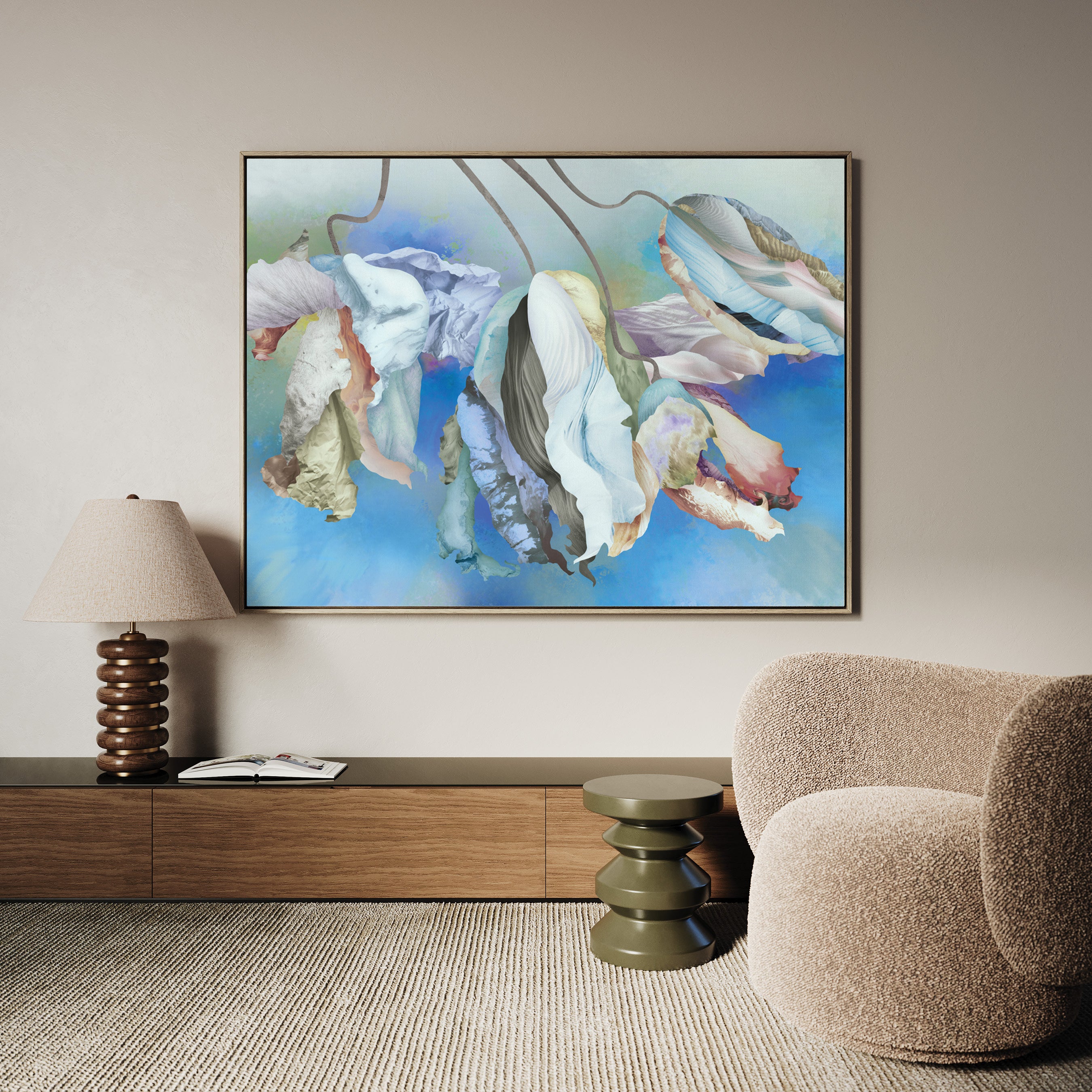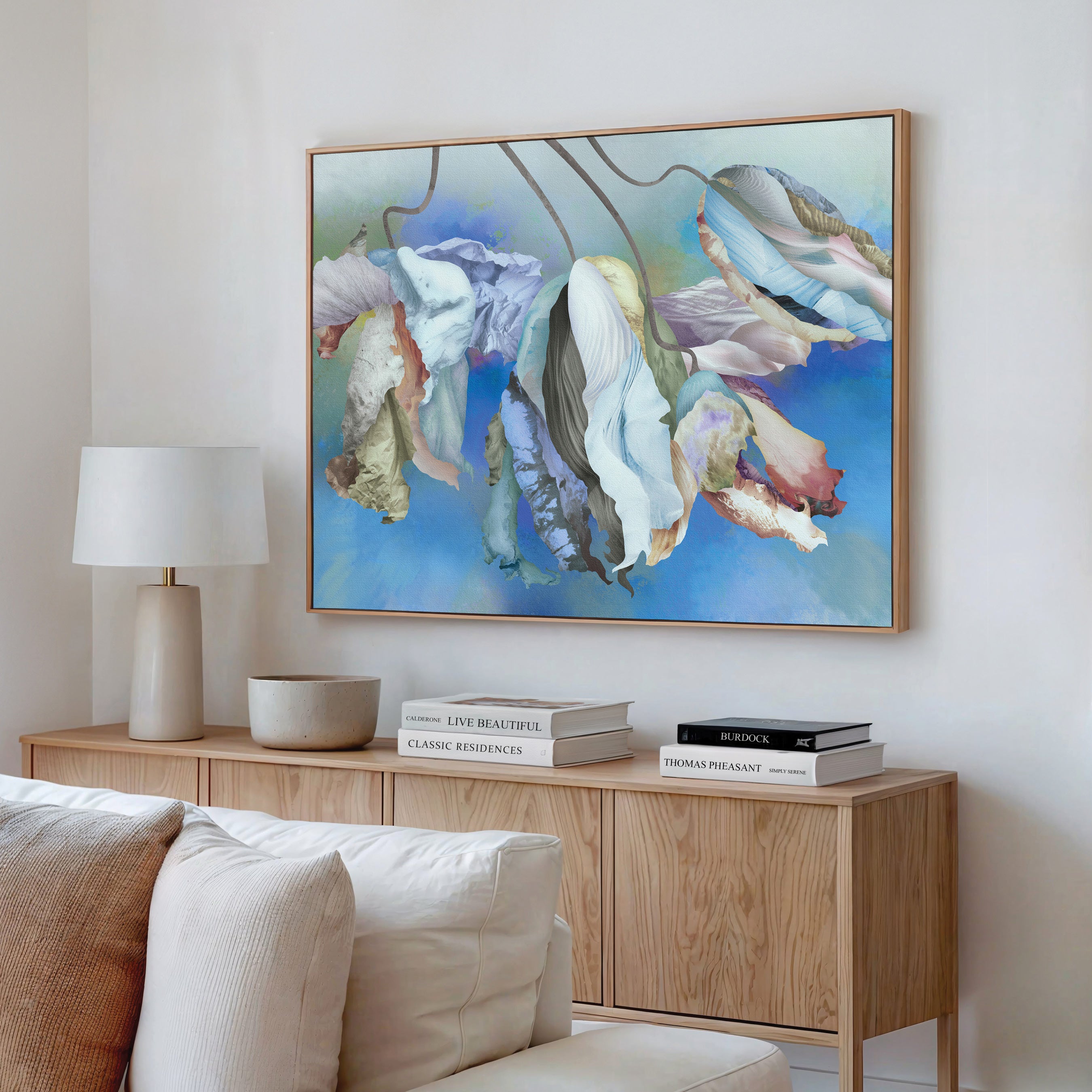 Canvas: Offered in a premium floating frame, where the artwork appears suspended within its border for a refined and dimensional effect. Frame finishes include Tasmanian oak, with its beautiful natural wood grain, or black and white timber with a smooth matte finish. All frames measure 5.5cm deep with a 1cm front face. A stretched canvas without a frame is also available, presenting the artwork with exposed edges for a clean, contemporary finish.