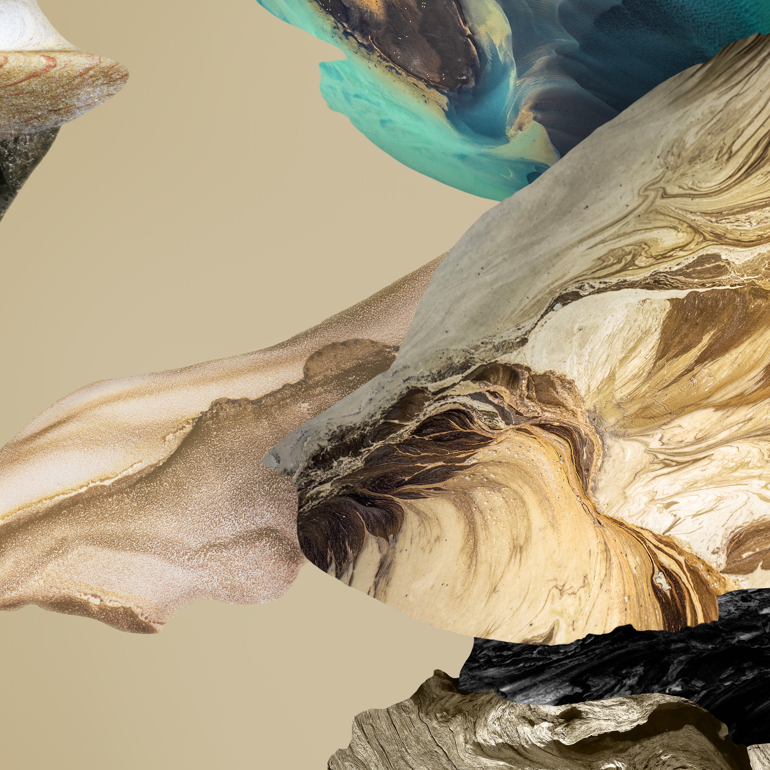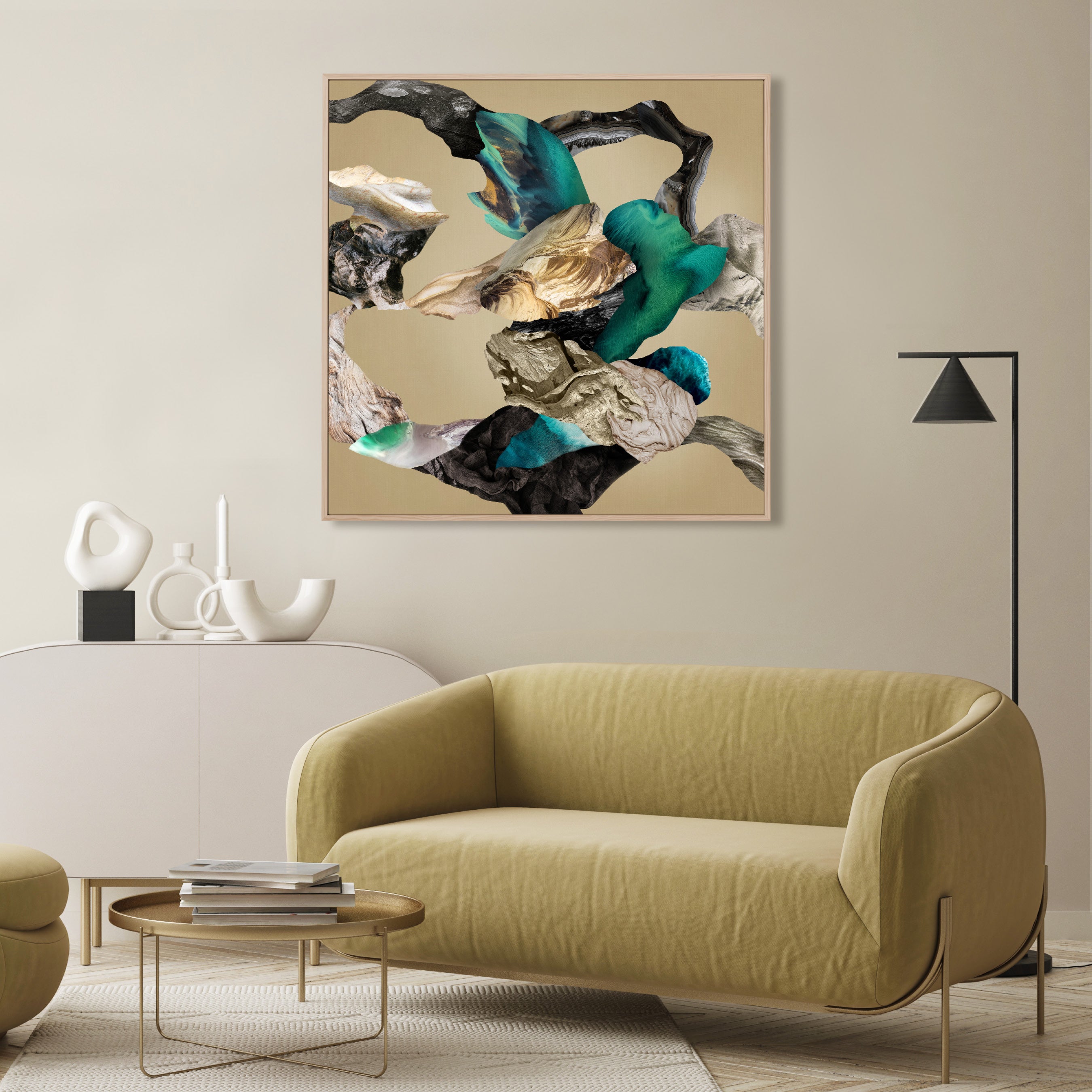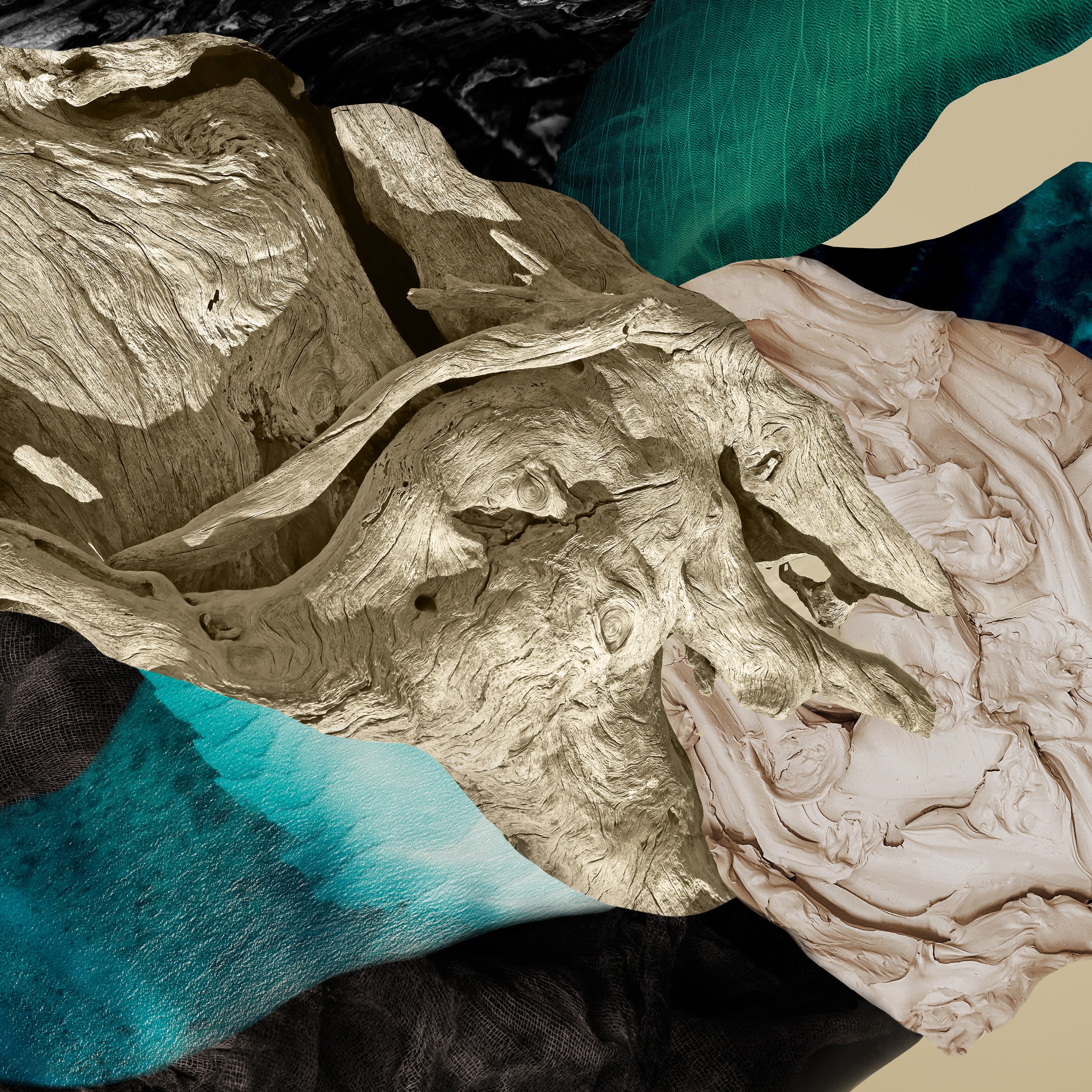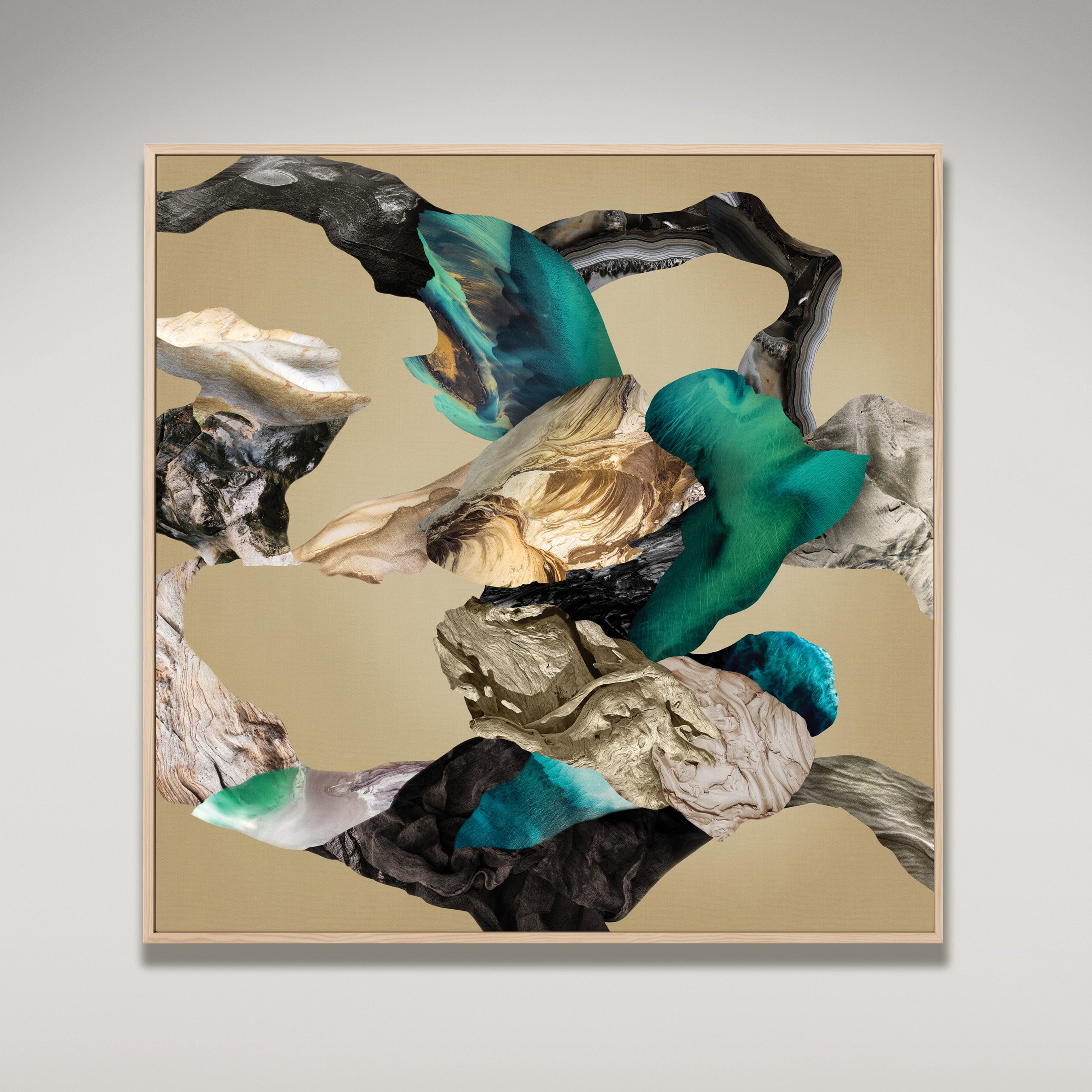 A striking composition reveals Earth's raw and rich elements, where gold, green, and teal-hued sapphires intermingle with semiprecious stones and rocky fragments. This artwork weaves a contorted web of textures, blending genuine minerals with unexpected elements, some far removed from earthy origins and placed at vastly different scales. The result is a curious tapestry, inviting viewers to explore nature’s enigmatic beauty.